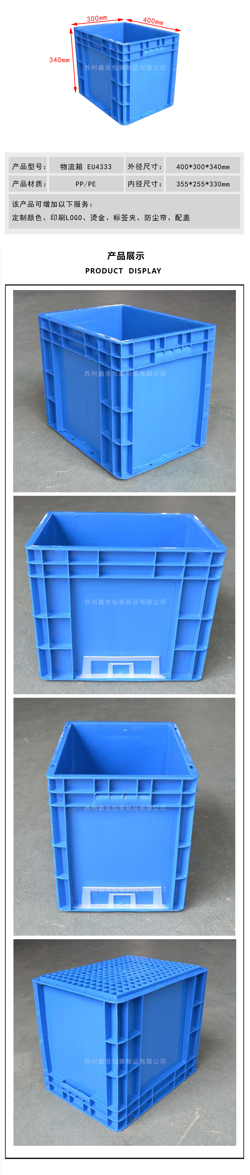●  蘇州鑫浩包裝制品有限公司專業(yè)研發(fā)生產(chǎn)各類物流箱、折疊箱、周轉(zhuǎn)箱、防靜電箱、塑料托盤等包裝產(chǎn)品,并提供